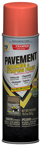 Champion Sprayon® Pavement Striping Paint is designed for striping asphalt, concrete or other paved surfaces. The discharge valve sprays only in a downward position. The universal tip fits all machines. Use it with a Champion Sprayon Paint Striper. Stripes 600-800 linear feet. Now toluene free; won't harm grass.